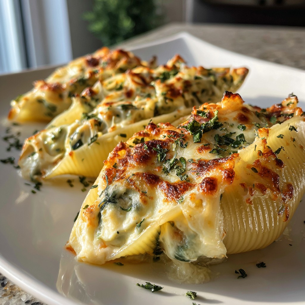 Chicken Spinach Artichoke Stuffed Shells blend classic Italian-American comfort food with beloved savory flavors. This satisfying pasta recipe features jumbo pasta shells filled with a creamy mixture of shredded cooked chicken, sautéed spinach, tangy artichokes, rich cheeses, and subtle herbs.